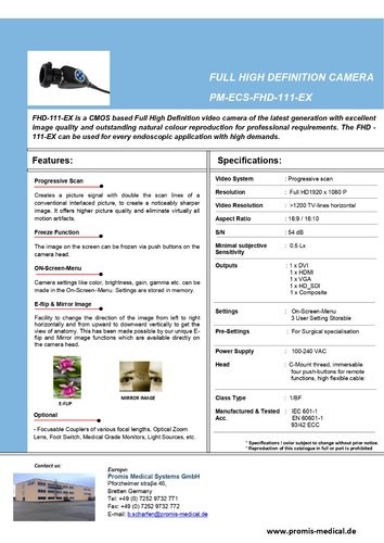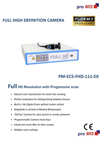 PM-ECS-FHD-111-EX is a CMOS based Full High Definition video camera of the latest generation with excellent image quality and outstanding natural color reproduction for professional requirements. It can be used for every endoscopic application.
